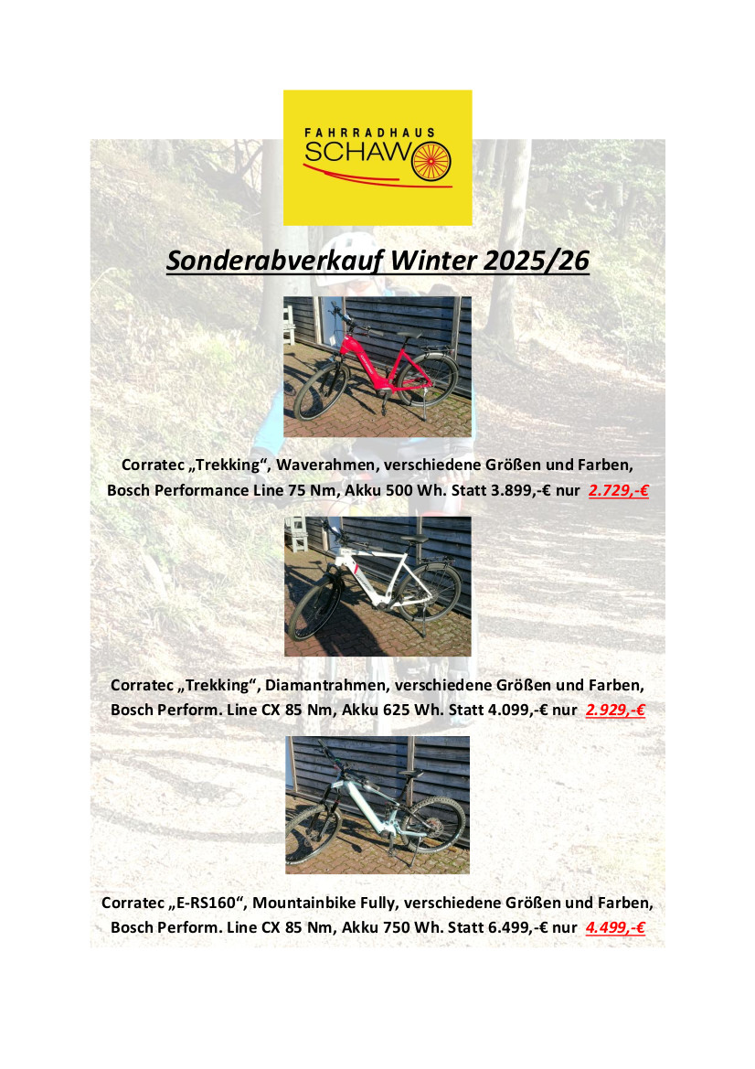 Mit dem Fahrradhaus SCHAWO bleiben Sie nicht radlos zurück! Unsere Philosophie ist es, das bestmögliche Fahrrad für Ihre Bedürfnisse zu finden. Daher nehmen wir uns auch gerne die Zeit für eine persönliche und individuelle Beratung. Selbstverständlich können Sie alle Modelle auch ausgiebig in unserer herrlichen Umgebung Probefahren. Sonderabverkauf Winter 2025/26!